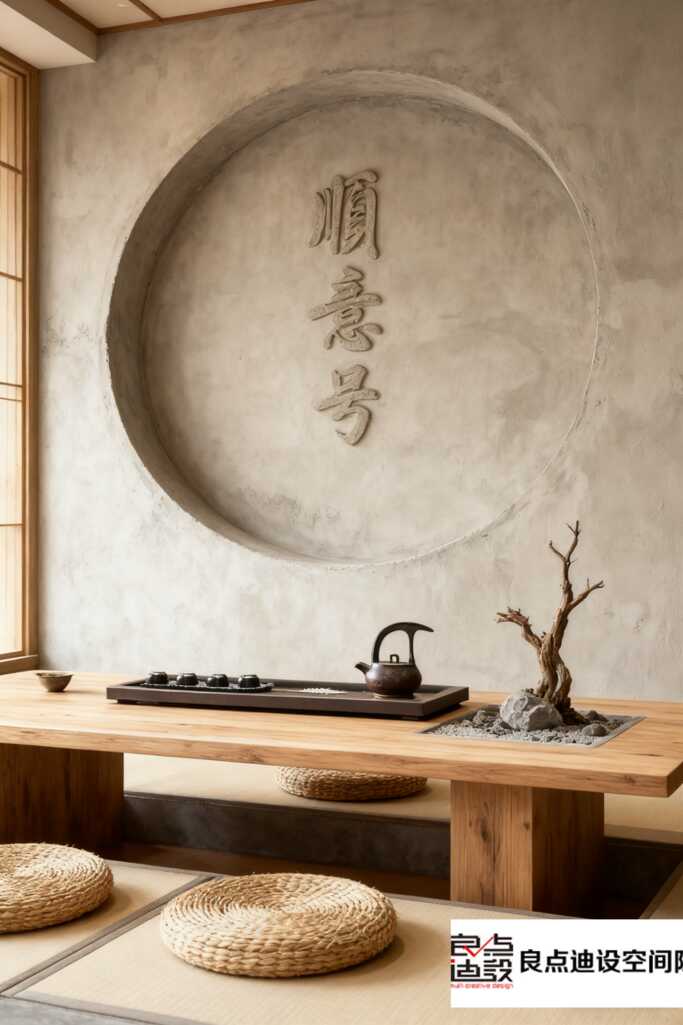先說(shuō)說(shuō)整體風(fēng)格哈。這款設(shè)計(jì)主打新中式,但不是那種老氣橫秋的傳統(tǒng)范兒,而是把禪意元素和現(xiàn)代簡(jiǎn)約***混搭。一進(jìn)門,視線立馬被那面水泥質(zhì)感的墻面吸引住,上面有個(gè)圓形凹槽,嵌著“順意號(hào)”三個(gè)字,古樸中帶點(diǎn)工業(yè)風(fēng),賊有故事感。墻面那種粗糲又溫暖的觸感,搭配淺木色地板,瞬間營(yíng)造出自然原始的基調(diào),仿佛能聞到淡淡茶香。