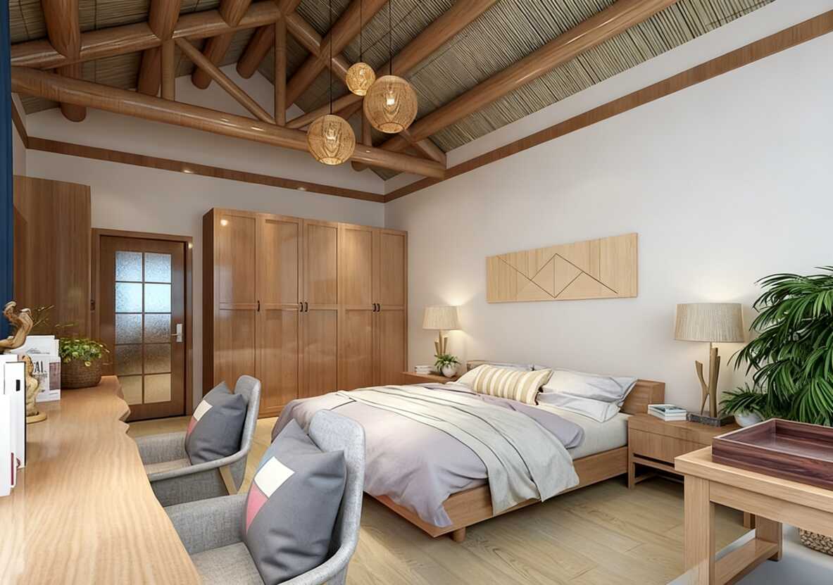 先看這空間的 “骨架”,木質房梁、通體原木的衣柜和書桌,天然感直接拉滿。但軟裝才是靈魂啊!